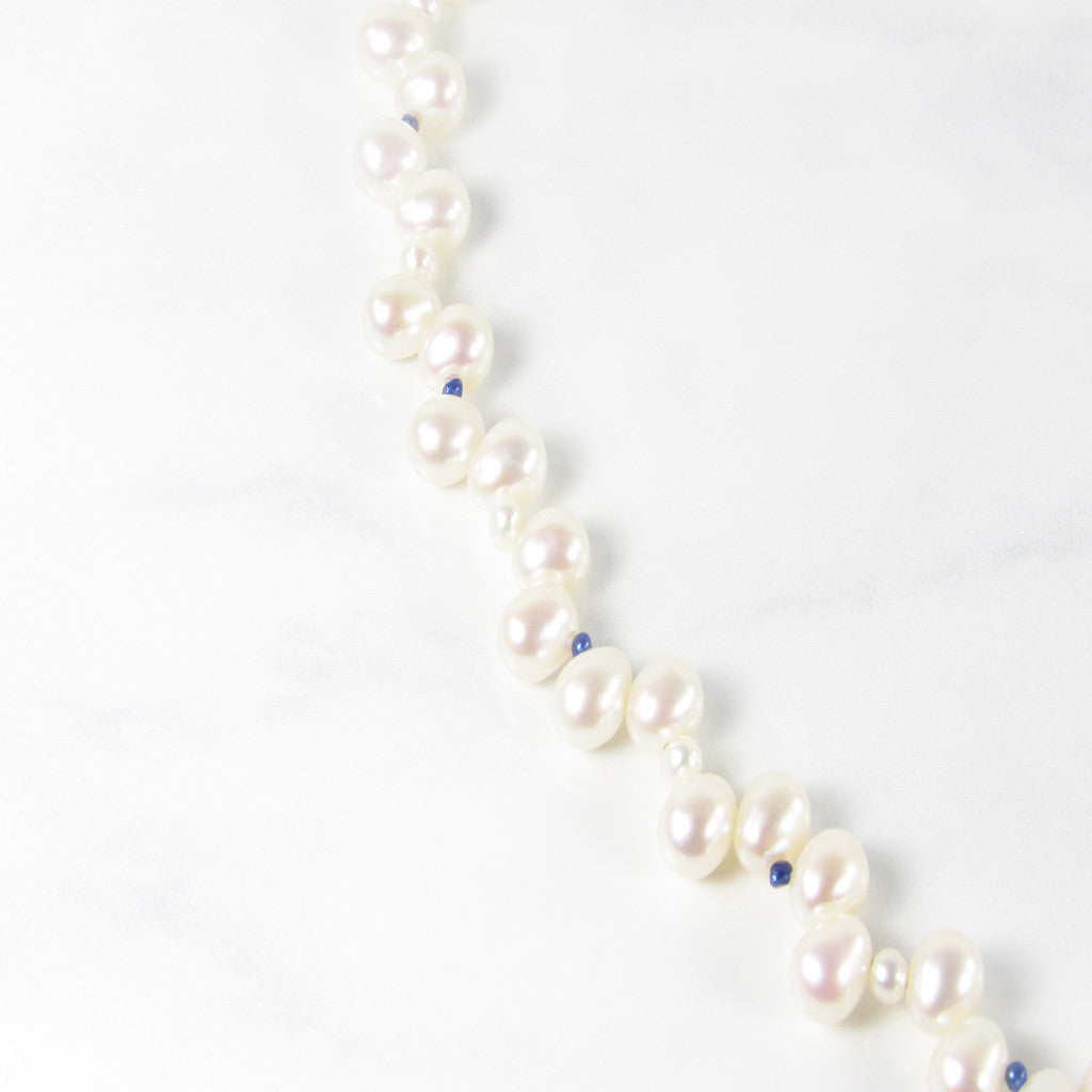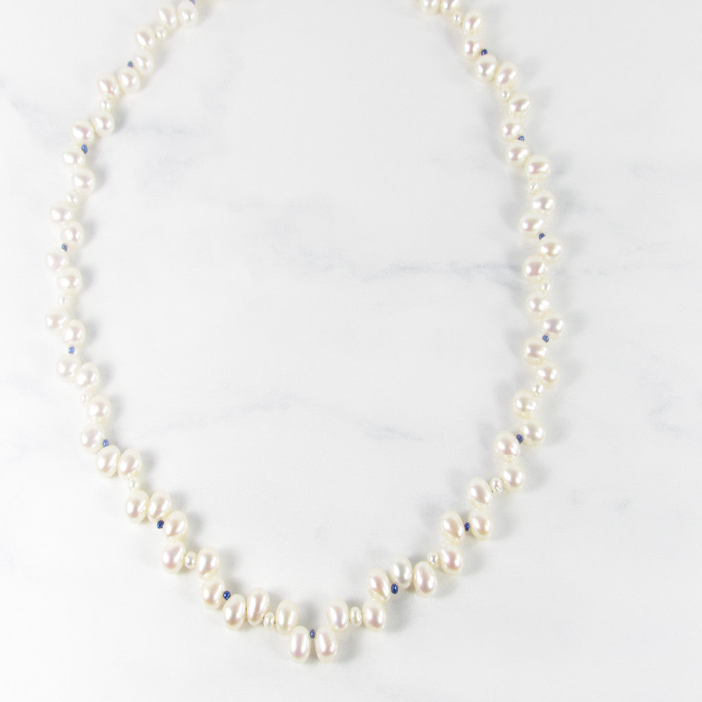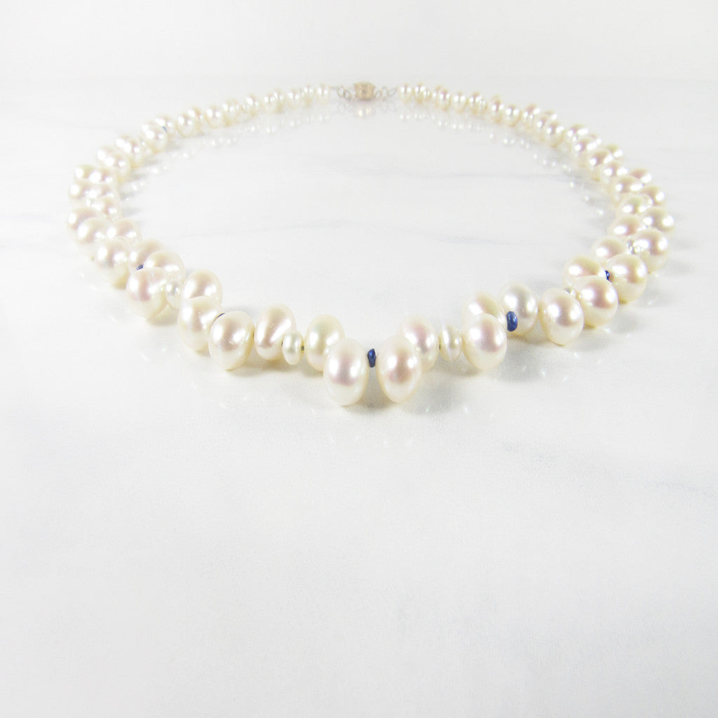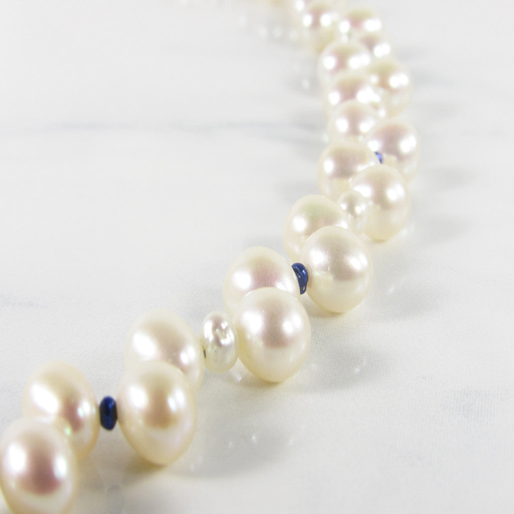 Tiny blue freshwater pearl nuggets are embedded between varying sizes of top-drilled pearls in this beautiful necklace.